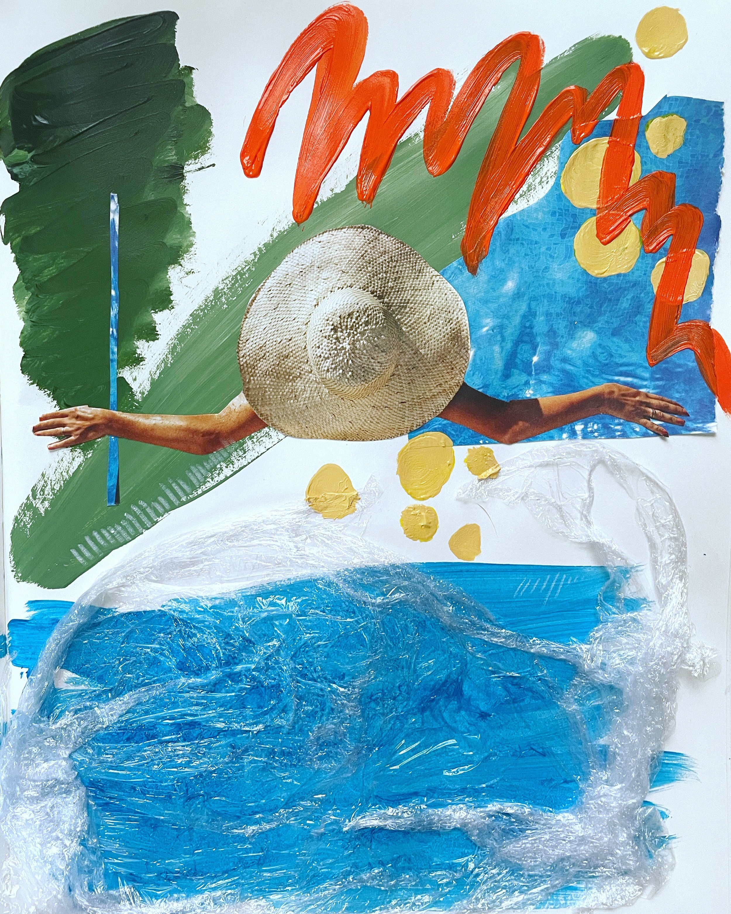 Mixed media artwork featuring painted blue water, green and white backgrounds, orange cursive text, a large straw hat, and cut-out photographs of arms reaching out.