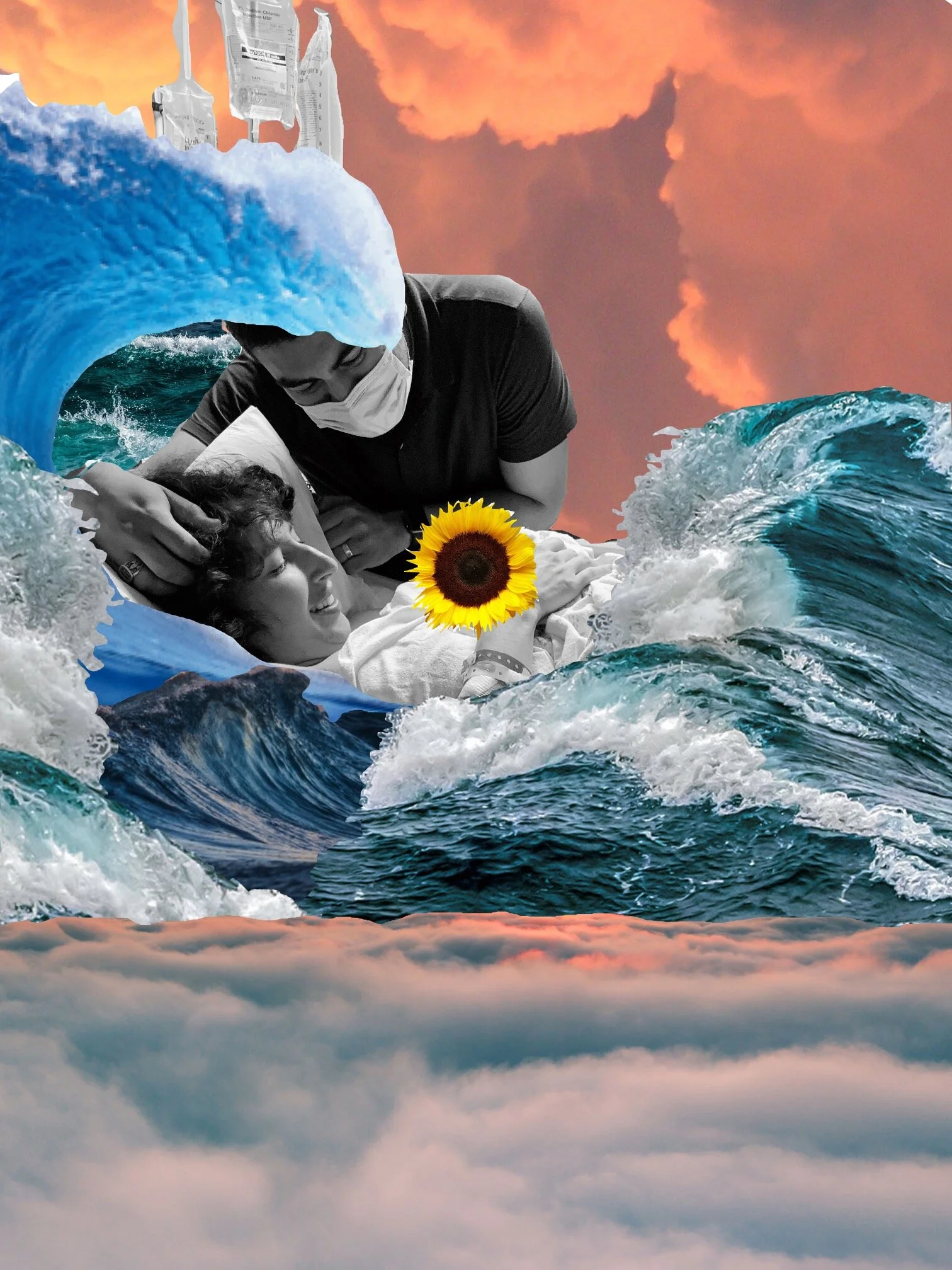 A collage featuring an ocean wave, a person in a mask picking up a woman with a sunflower, and a sunset sky with clouds.