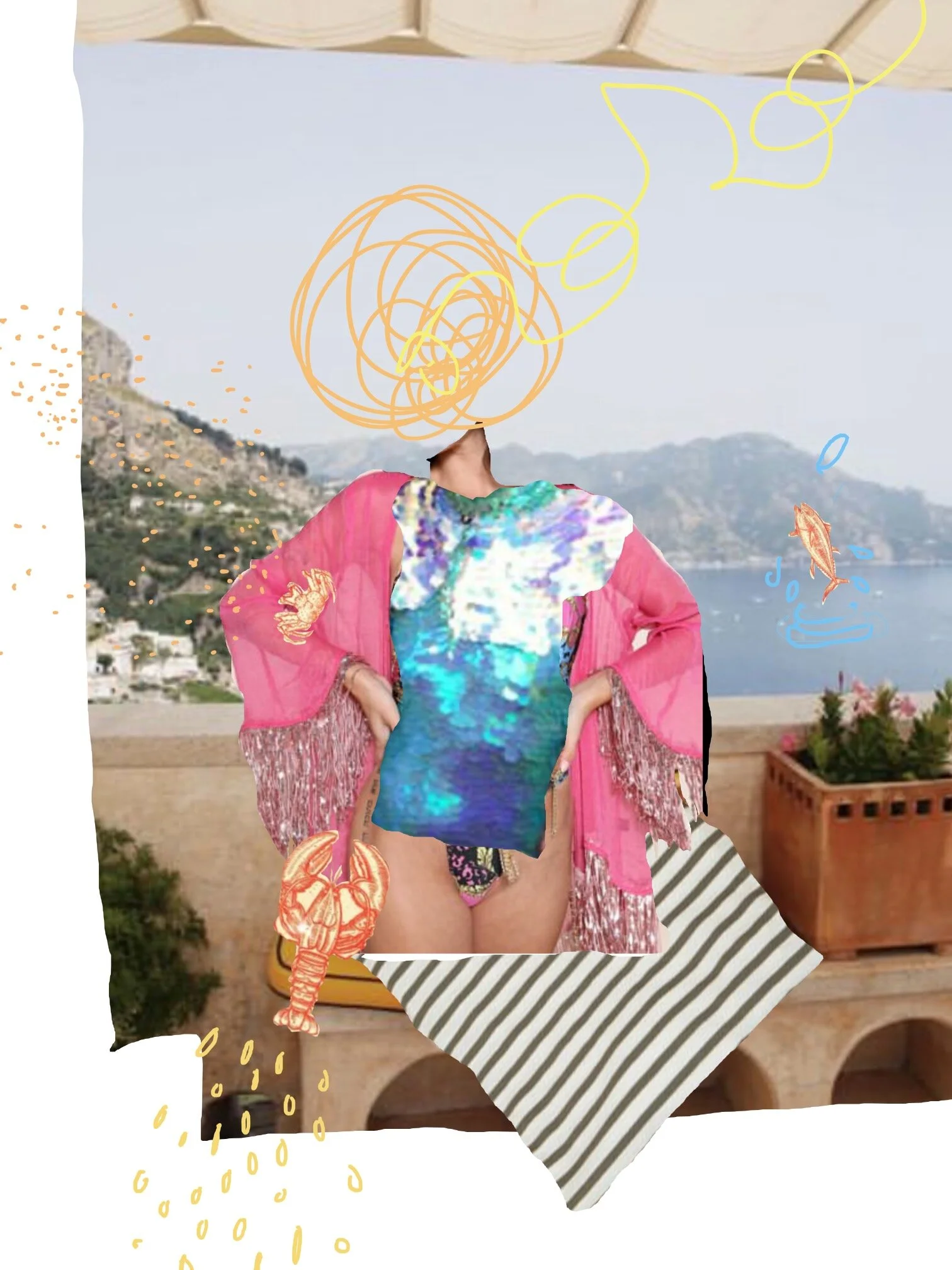A collage art piece combining a person wearing a colorful dress and pink shawl, with a background of a scenic lake and mountains. The person's head is replaced with yellow and orange doodles, and the collage includes drawings of a lobster, fish, and