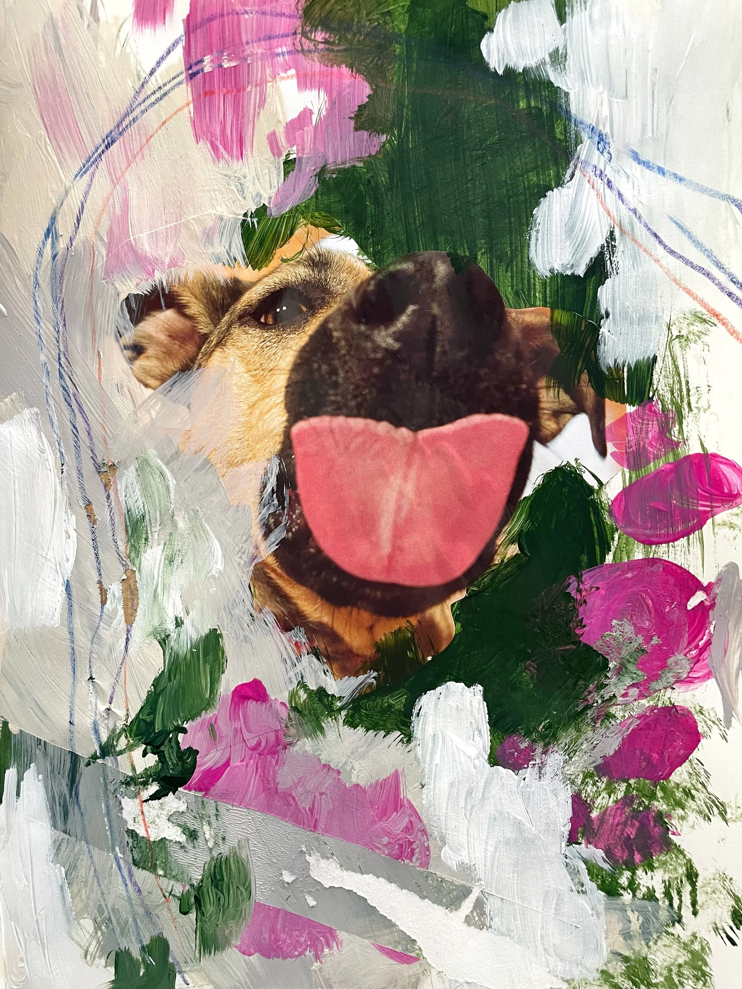 A dog with its nose close to the camera, surrounded by an abstract painting with pink, white, and green brushstrokes.