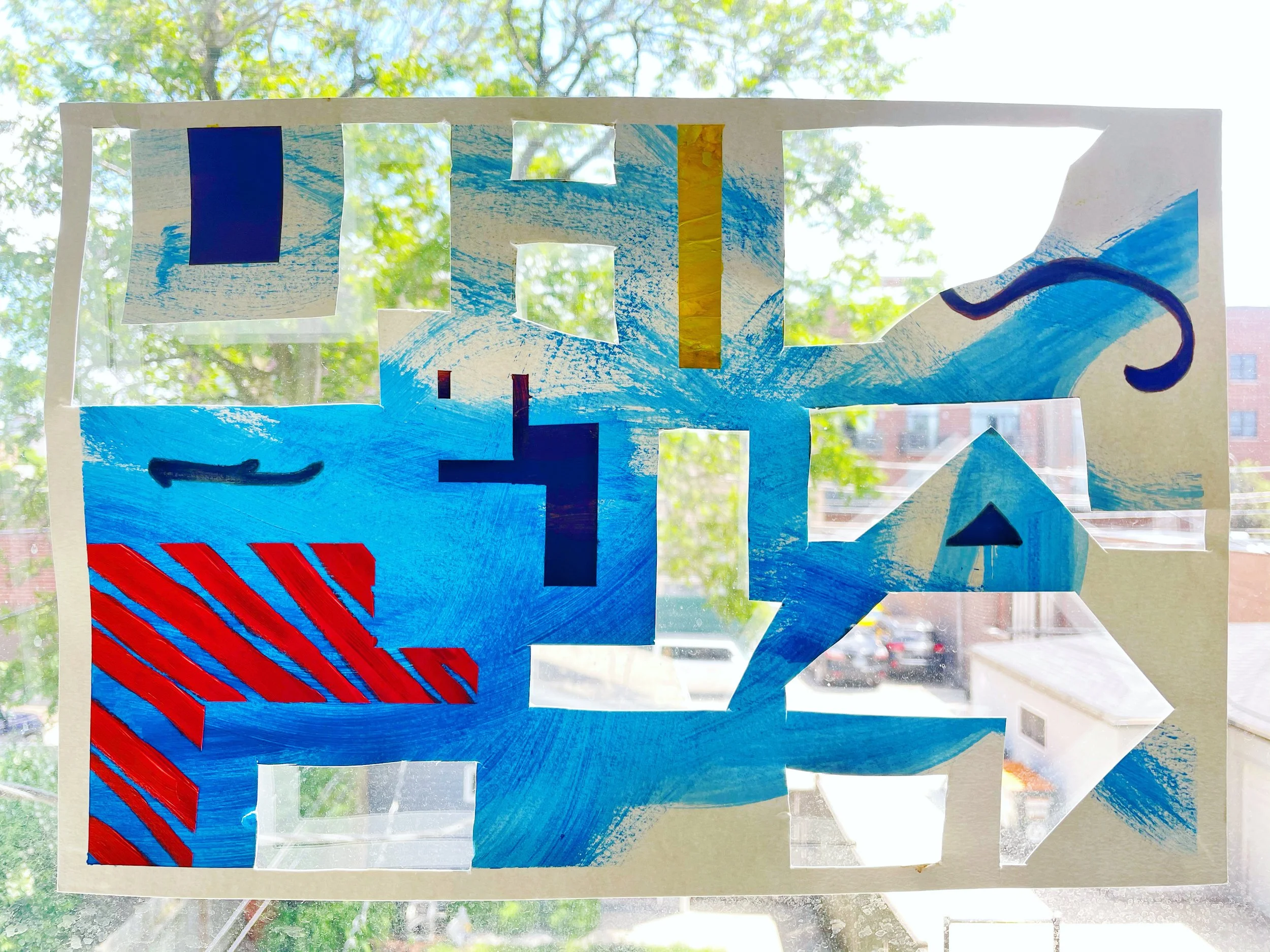 A window decorated with cutouts painted in blue, white, yellow, and red, forming abstract shapes and patterns, with trees and buildings visible outside.