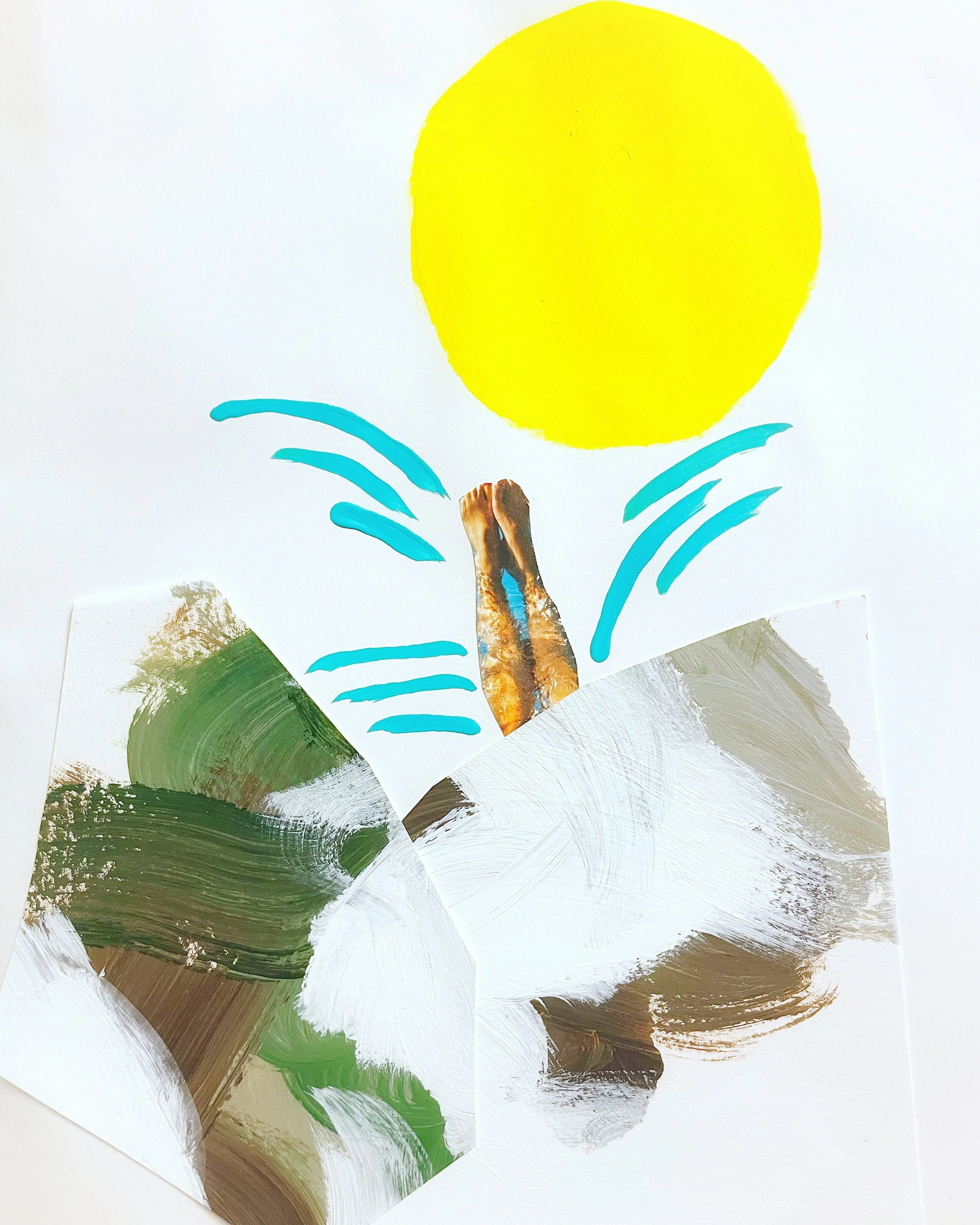 Artwork depicting a sun with yellow circle, blue lines representing water or waves, and cut-outs of painted paper with green, brown, and white brushstrokes, along with an image of hands and legs reaching upward. View fullsize