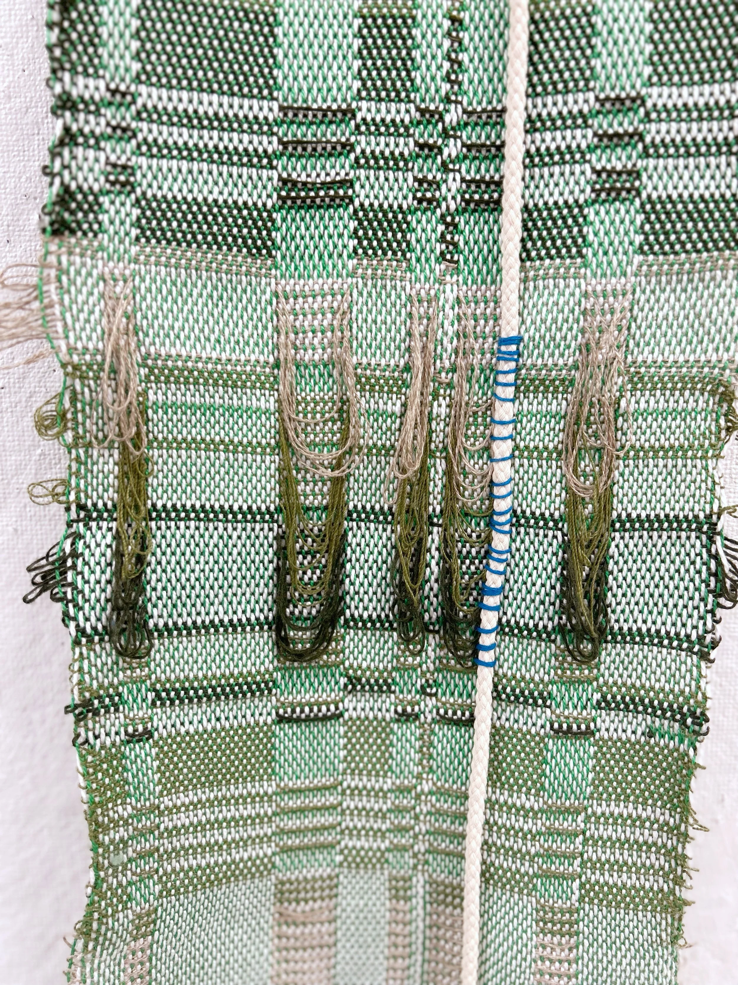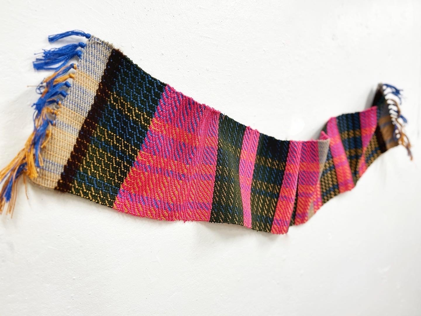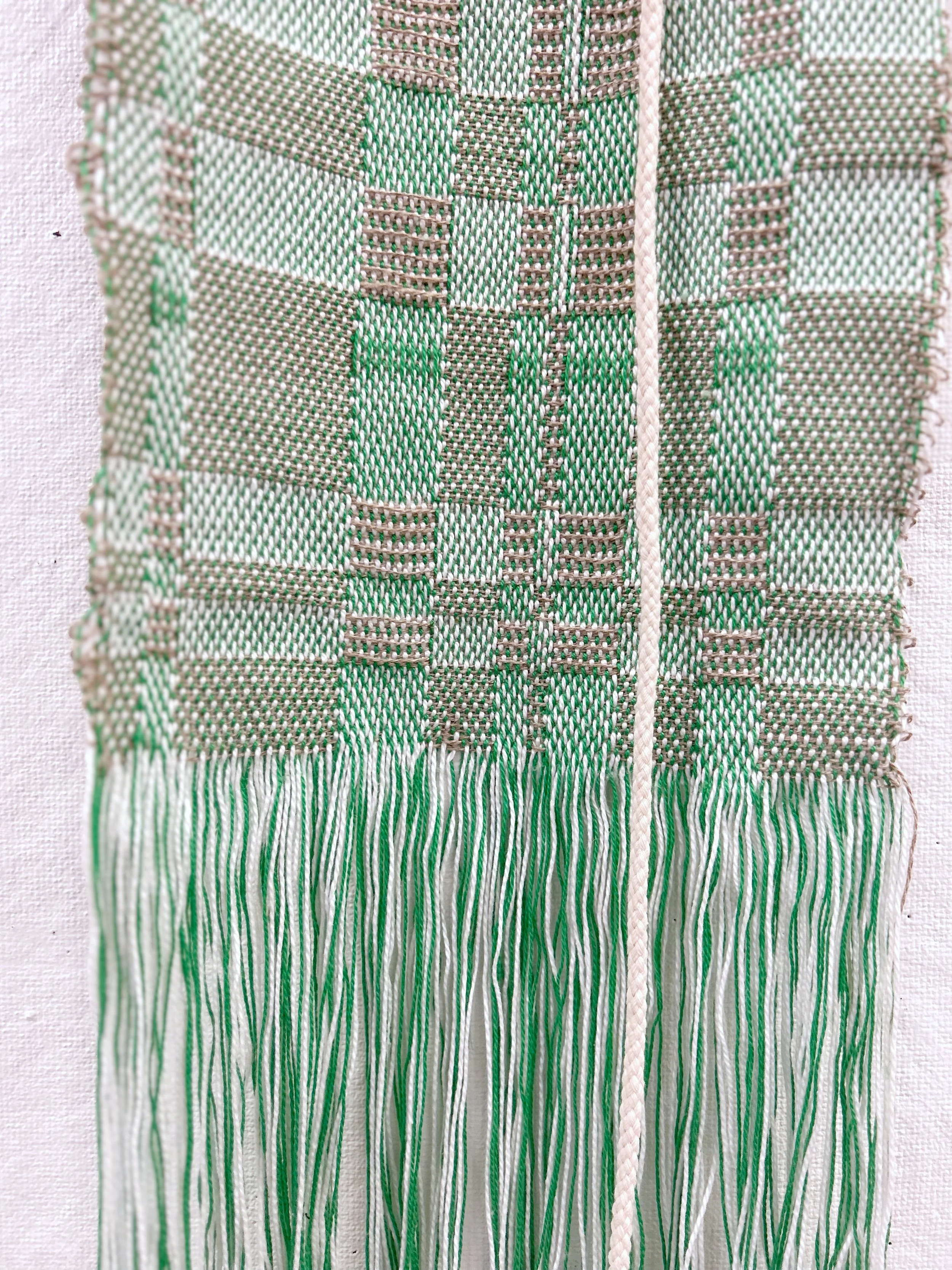 Close-up of a woven fabric with a black and white pattern and fringed edges, laid on a white surface.