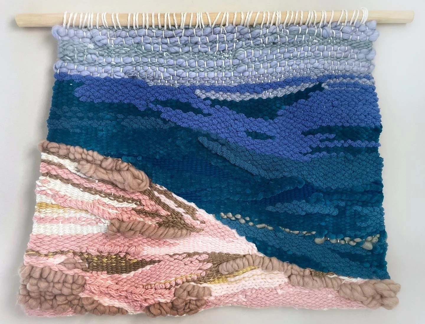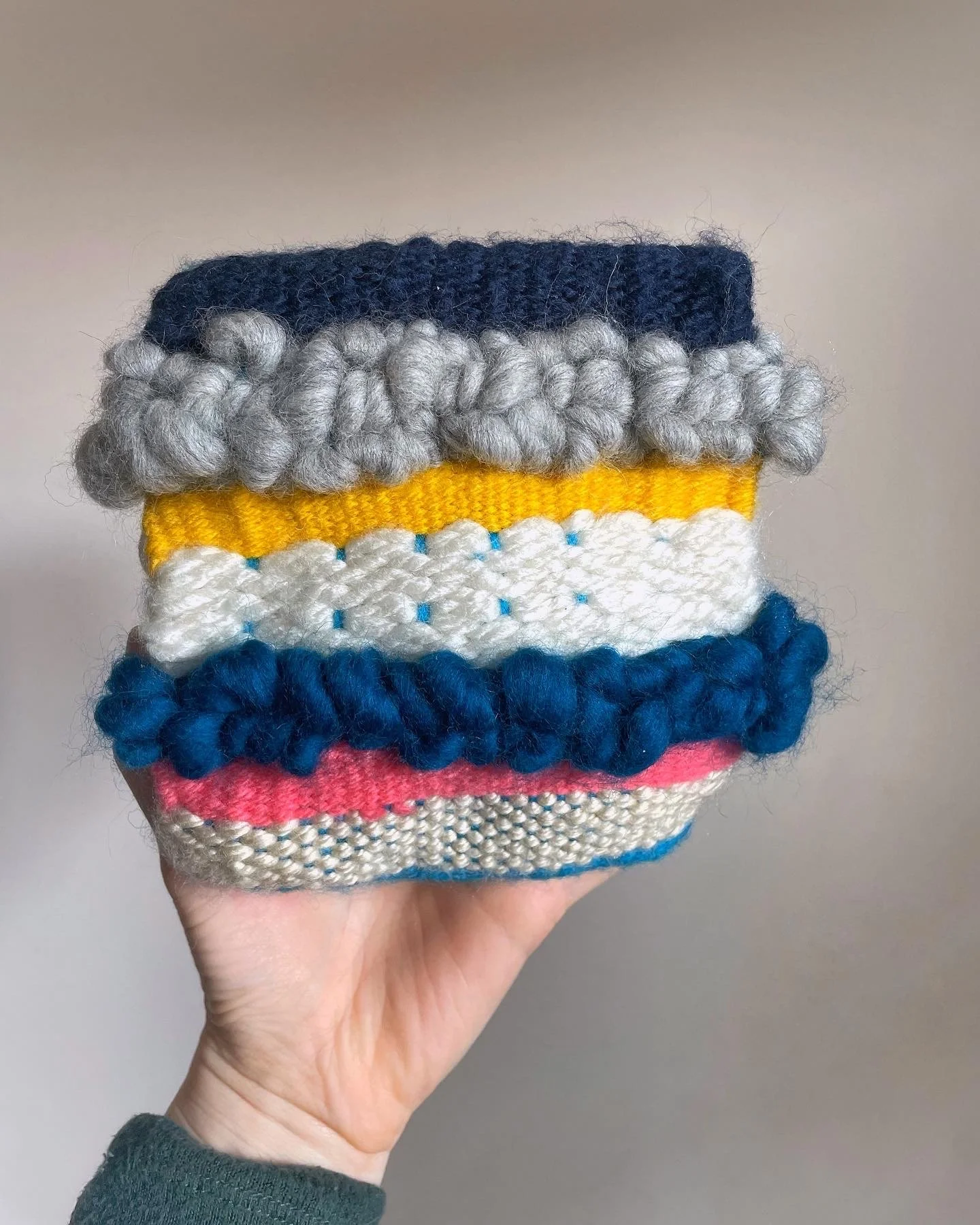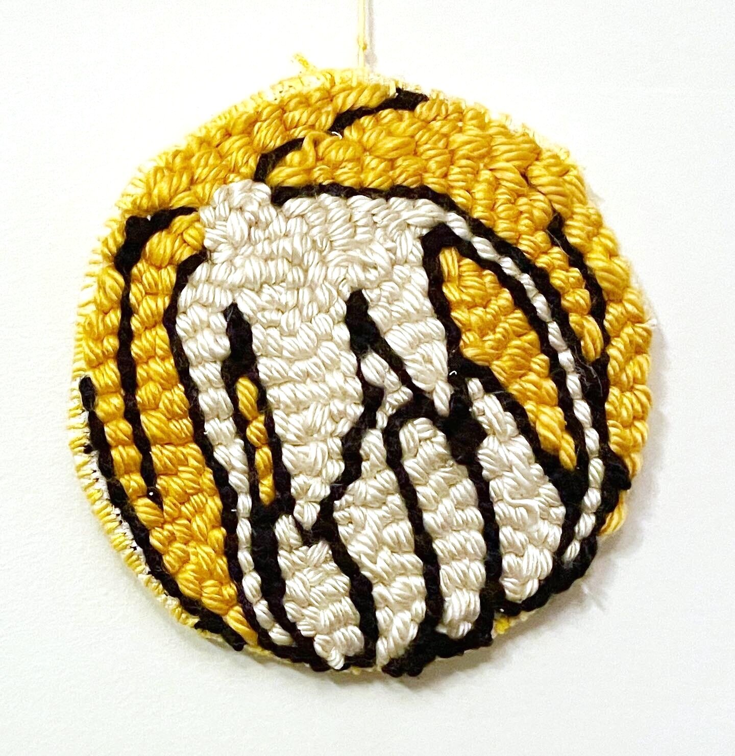 Close-up of a woven fabric with a black and white pattern and fringed edges, laid on a white surface.
